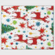 A festive Christmas pattern. It features red reindeer, green Christmas trees, blue snowflakes, and red stars on a white background. The pattern repeats seamlessly, creating a cheerful and festive design. It would be perfect for wrapping paper, greeting cards, or other holiday decorations.