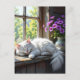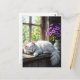 Keep in touch with this gorgeous postcard featuring a napping cat sleeping on a rustic window sill next to a vase of purple flowers.