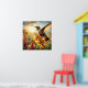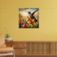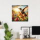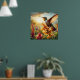 A vibrant painting capturing a hummingbird delicately perched on a colourful flower, its iridescent wings shimmering in the sunlight.