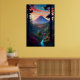 Experience the breathtaking view from the edge of the forest, gazing towards a huge volcano in the distance. The forest's green canopy contrasts with the majestic presence of the volcano, creating a scene of awe and wonder. Immerse yourself in the beauty of this picturesque digital art, where the harmony of nature and the grandeur of the volcano converge in a mesmerising panorama.