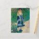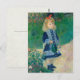 This delightful oil painting was painted by Pierre-Auguste Renoir in 1876. The lovely child is Mademoiselle Leclere, wearing a blue dress and holding a watering can. Renoir was in Impressionist. You can see that, rather than blend the colours of the painting, Renoir applied them with individual touches of the brush that dissolve edges and seem to shimmer with light. (The design you see on the inside of this postcard is a beautiful white floral jacquard fabric pattern.)