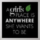 A girl's place is anywhere she wants to be in white on a black background with The Girls' School logo leaf in leaf green.