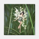 A painting of a garden fairy startled in the grass as she flutters around a garden.