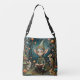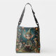A young gnome or elf reads a book in a magical forest, as strange and fae creatures gather around on this cute and fun crossbody bag.  Perfect for anyone who loves fantasy and fairy tales.
