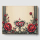 A gothic romance. An ornate, gothic-style frame surrounding a beige background. Red roses with dark green leaves are arranged around the frame, particularly in the corners. At the bottom centre, there is a decorative heart-shaped emblem with the word "LOVE" inscribed in a stylised font.