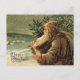 Vintage Christmas card from the 1800s. Santa Claus is shown walking through a winter forest with a bag of gifts on his back.