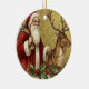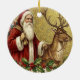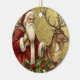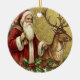 This vintage-style holiday ornament features a classic illustration of Santa Claus dressed in a traditional long red robe with white fur trim, carrying a sack overflowing with dolls and toys over his shoulder. He stands alongside a large reindeer, holding its leather bridle against a textured, gold-colored background. The scene is framed along the bottom by festive boughs of holly with red berries and mistletoe with white berries,