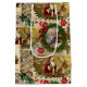 This design features a repeating Christmas pattern that looks like old-fashioned wrapping paper. It displays classic pictures of Santa Claus in his red suit standing next to a reindeer, along with large green holly wreaths tied with red ribbons that circle a snowy winter scene. The design is filled with traditional holiday details like lit candles, scrolls with greetings like "A Happy Christmas Tide," and warm colors that create a cozy and festive feeling.