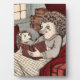 An intricate illustration depicts a large hedgehog, likely a mother, sitting on a chair and reading a book to a smaller hedgehog, presumably her child. The mother wears a white dress with a white collar, while the child is dressed in a brown shirt with a white collar. The book is open and has a dark red cover. The scene is lit by a lamp with a white shade, casting a warm glow on the hedgehogs.