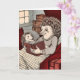 A detailed illustration depicts a great hedgehog, probably a mother, sitting on a chair and reading a book to a smaller hedgehog, presumably her child. The mother wears a white dress with a white collar, while the child is dressed in a brown shirt with a white collar. The book is open and has a dark red cover. The stage is lit by a lamp with a white lampshade, shining a warm glow on the hedgehogs.
