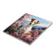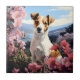 The image on this tile features a Jack Russell Terrier sitting amidst a flourish of soft pink blooms. The dog's keen eyes and perked ears convey a sense of alertness and curiosity, characteristic of its lively breed. The foreground is a riot of color with the delicate petals of the flowers, contrasting beautifully with the Terrier's smooth white and tan coat. In the background, a serene landscape stretches out, offering a glimpse of rolling hills and a clear blue sky dotted with fluffy white clouds. This image is a celebration of nature's splendor, with the charming Terrier serving as both a companion and a vibrant part of the floral tableau. generativecontent
