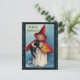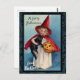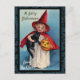 This early 1900's vintage illustration features a little girl in a white nightgown, red witch's hat and cape with a black cat and jack-o-lantern. The caption above wishes everyone "A Jolly Halloween". Background image is a night sky with a black vintage lace overlay. Personalise with your name or special message.