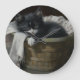 This painting focuses on an adorable black and white kitten nestled on top of a white blanket in a basket tucked in a cosy corner. The kitten's eyes are bright and curious, and it appears to be playfully reaching for the fringe on the edge of the blanket. The little white strings of the fringe are just so tempting! The surrounding area is dimly lit, creating a sense of warmth and intimacy. The painting exudes a feeling of comfort and tranquillity, as if the viewer has stumbled upon a serene moment in the life of this playful little feline. The details in the painting all come together to create a charming and endearing scene that will delight any cat lover.