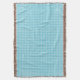 "A light blue and white checkered blanket with brown fringe. Shown in two orientations: horizontal and vertical, highlighting its texture and pattern."