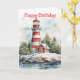 A red and white lighthouse in winter. Suitable for a birthday for anyone