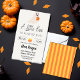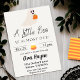 A little boo is almost due Halloween baby shower invite featuring a cute little ghost holding a small pumpkin set on a cream background with a black frame. The cute handwritten fonts mixed with modern lettering makes this a unique, sophisticated invite with small touches of Fall such as candy corn and pumpkins.