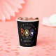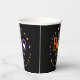 Cute Halloween-themed baby shower paper cups featuring the phrase "A little boo is almost due" in orange, yellow, and purple hand-lettering with white ghosts on a black background. Colourful stars and dots encircle the design. Personalise the Halloween baby shower paper cups with the mother-to-be's name.