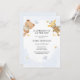 A little boy is on the way boys baby shower invitation featuring cute teddy bears, stars, half moons, pastel love heart cushions, and blush background.