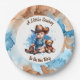 Cute Little Cowboy Baby Boy and Teddy Bear Blue and Brown ai watercolor illustration baby shower paper plates. A little cowboy is on the way.
