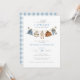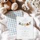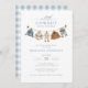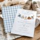 Rustic cowboy baby shower invitation for a baby boy featuring an adorable western theme with watercolor illustrations of baby clothes hanging on a rope, including cowboy boots, denim, flannel, and a tiny fringed jacket. The design combines soft tan and blue tones with playful yet elegant typography that highlights the “A Little Cowboy is on the Way” headline in a charming script and serif mix. The back displays a classic baby blue gingham chequered pattern, adding warmth and country flair. Perfect for country baby showers, western-themed celebrations, and outdoor gatherings, this invitation delivers a heartfelt and stylish way to celebrate the upcoming arrival of a little cowboy. Available as printed cards or an instant digital download.