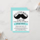 Cute and fun moustache baby shower invitation (4.5 x 6.25") for boys featuring a black handlebar moustache and the text "A little man is on his way, please join us for a baby shower". Customisable name and party information.