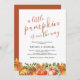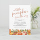 Rustic autumn baby shower invitations featuring a simple white background, elegant watercolor leaves and pumpkins, and a modern "a little pumpkin is on the way" template that is easy to personalise.