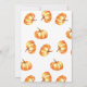 On the front, in the upper part, it has a pumpkin in orange and yellow watercolor. Above it, there is the arched text "A little pumpkin is on the way" in arched brown letters. Under the pumpkin, the words "baby shower" and the name are written in an orange handwriting script, the rest in smaller brown caps.