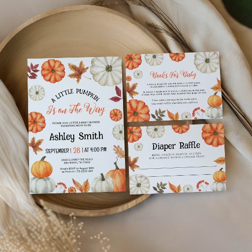 Celebrate your little one with this charming "A Little Pumpkin Is On The Way" baby shower invitation. Featuring watercolor pumpkins, fall leaves, and warm seasonal tones, it's perfect for an autumn baby shower.