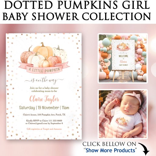 Invite loved ones to a sweet autumn celebration with this "A Little Pumpkin is on the Way" Baby Shower Invitation! Featuring adorable dotted pumpkins in soft pink, orange, cream, and green shades on a white background with a fun whimsical polka dot pattern. This invitation is perfect for a charming fall-themed girl baby shower. Customise the text to create a unique and joyful invite for your special day. - Kate Eden Art