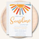 This cute sun-themed baby shower invitation features the text "A little ray of sunshine is on his way!" in stylish typography with a watercolor sun in shades of blue and yellow.