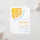 This cute sunshine boy's baby shower invitation features the text "A little ray of sunshine is almost here!" in blue with a yellow sun.