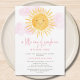 Are you planning a sun-themed baby shower? This cute sunshine baby shower invitation features the text "A little ray of sunshine is almost here!" with a watercolor smiling yellow sun and pink clouds. The back is decorated with a sun pattern. Perfect for a baby girl's shower. Easily customisable. Original Watercolor © Michele Davies.