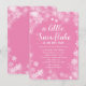 A little snowflake is on her way baby shower invitation begins with a pink background with bright white snowflakes. Your baby shower details are written in a variety of fonts to create a pretty typographic display. Perfect invitation for a winter baby girl shower.