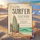 This vintage-inspired baby shower invitation features a rustic surf theme with a weathered beige background, a classic green-striped surfboard leaning against a wooden fence, and scattered seashells on the sandy shore. The scene is completed by turquoise ocean waves with a small surfboard riding the swell, evoking a nostalgic beachside charm. If you need any other matching product or customisation, kindly message via Zazzle.