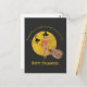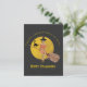 Cute Halloween altered art design features vintage school girl sitting on broom with witch's hat, black cat and golden full moon. Text : There's a little witch in all of us. Happy Halloween