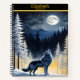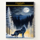 In a serene winter landscape, a majestic wolf stands amidst tall evergreen trees, its head lifted in a haunting howl towards the glowing full moon. The night sky sparkles with stars, creating a magical atmosphere in the tranquil wilderness.