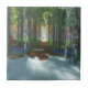 A forest walk through the seasons, from winter snow, to spring bluebells and azaleas, to summer green and clover, to the bright yellows and oranges of autumn leaves, and back to snow. A bright red autumn tree marks the end of the perspective back to winter again.