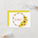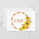 Lovely and bright, this sunflower RSVP features a white background with a yellow sunflower wreath that has "RSVP" written inside in lovely orange font. The back displays important information on a yellow background. Personalise yours today!