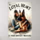 A young woman sits with her German Shepherd dog, both looking at each other with love and affection. The background features a warm, autumnal setting with fallen leaves and tall grass