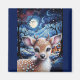 A whimsical fawn stands in the foreground, surrounded by a magical winter night with a full moon glowing brightly in the sky. In the background, a cosy cabin nestles among snow-covered trees.