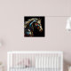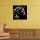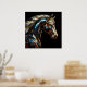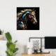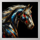 A side-view portrait of a stunning horse in abstract style. This artwork features an artistic stained glass technique with golden lines, filled with vibrant red, blue, orange, black, and silver hues against a dark background. The result is a majestic portrayal of a stallion exuding regal splendour.