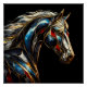 A side-view portrait of a stunning horse in abstract style. This artwork features an artistic stained glass technique with golden lines, filled with vibrant red, blue, orange, black, and silver hues against a dark background. The result is a majestic portrayal of a stallion exuding regal splendour.