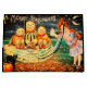 "A Merry Halloween." Vintage postcard, ca. 1910. Girl blowing a horn with three Jack-o-Lantern."