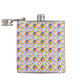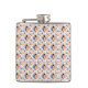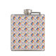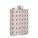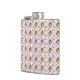 A metal flask is shown with a vibrant geometric mosaic pattern, featuring red, blue, and yellow shapes. The design appears on both the front and side views.