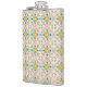 A metal flask with a colorful, symmetrical pattern of floral motifs in blue, orange, and yellow on a pale pink background, conveying a vintage, playful tone.