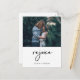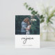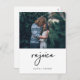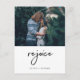 This ultra modern, minimalist holiday postcard says "rejoice" in handwritten black script on the front, along with your personal photo and your names for a simple and stylish Christmas greeting.