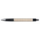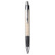 "A modern pen with a metal tip and clip, featuring a beige textured grip and black accents. Shown from two angles, front and bottom, on a white background."