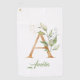 A monogram greenery eucalyptus gold glitter golf towel personalised with name, can be used for Bridal Shower, Baby Shower, Wedding Engagement, Anniversary or Birthday event celebration party. Amazing design featured watercolor green eucalyptus leaves woven into letter A and mixed faux gold sparkles and splashes. Eucalyptus greenery leaves elegantly woven into faux gold foil letter A and gives to aesthetic at the whole vision. Personalised with name, Design can be used for Bridal Shower, Baby Shower, Wedding Engagement, Anniversary or Birthday event celebration party. Contact me for matching items or for customisation, Violet Prints ©
