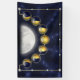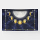 This sparkling design illustrates the lunar cycle in bright gold and deep blue. The jewels representing the moon phases run in a semi-circle from waxing crescent, to first quarter, waxing gibbous, full moon, waning gibbous, last quarter, and ending on a waning crescent. They are set against a fractal backdrop like the starry sky, with a silvery glowing moon photo from NASA to complete the piece.