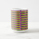 The design features a pattern consisting of horizontal stripes in various colours, including yellow, green, purple, and pink. Between these coloured stripes are thinner white stripes. Each coloured stripe is adorned with a sequence of small dots that are evenly spaced along the length of the stripe. The dots appear in contrasting colours to the stripe they are on, such as white dots on the purple and green stripes and black dots on the yellow and pink stripes. This repetitive pattern creates a visually stimulating texture that could be used for backgrounds, textiles, or other design elements due to its vibrant colours and rhythmic dot sequences.